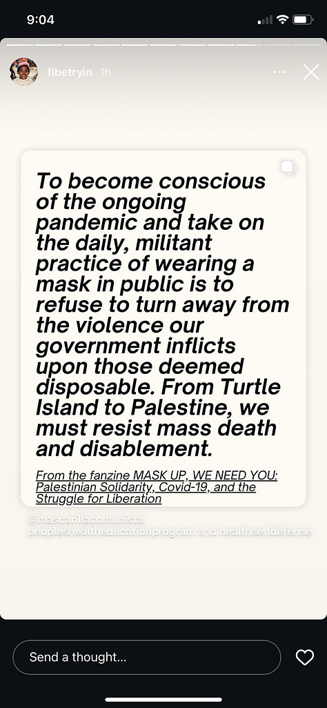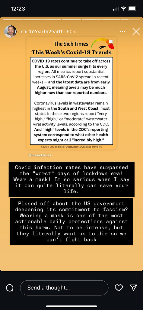 I’ve been in transparently darker grey area with my masking. I continue to do it in public transportation and crowded spaces. In the heat and honestly some socially motivated ‘I feel weird being the only one’, ‘this place isnt full really I’ll be okay I think’ ‘I don’t wanna have to speak loudly’ moments I haven’t worn it. I do feel that guilt and shame and contend with my values in the after of those outings.
